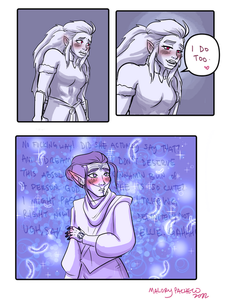 Two bashful adventurers put down their swords and talk about their feelings for each other.